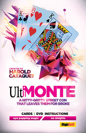 Ultimonte is the 3 card scam with all the eye popping theatrics - but none of the sleight of hand. Show three cards - an Eight of Spades is sandwiched between two court cards. Shut the fan - WHAMMO! - The Eight jumps to the bottom of the packet. Just as fast as you can re-fan the cards, it's jumped back to the center! It's unbelievable and lightning quick.