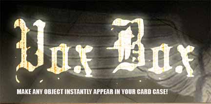 Vox Box is magic's most ingenious and innocent looking rattle box, invisibly built into something you always have on you - your card case! 100% custom fabricated by MagicSmith and designed to give you years of performances.